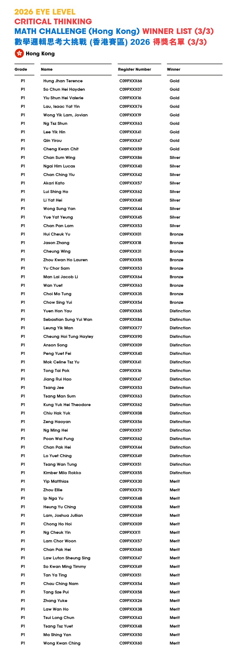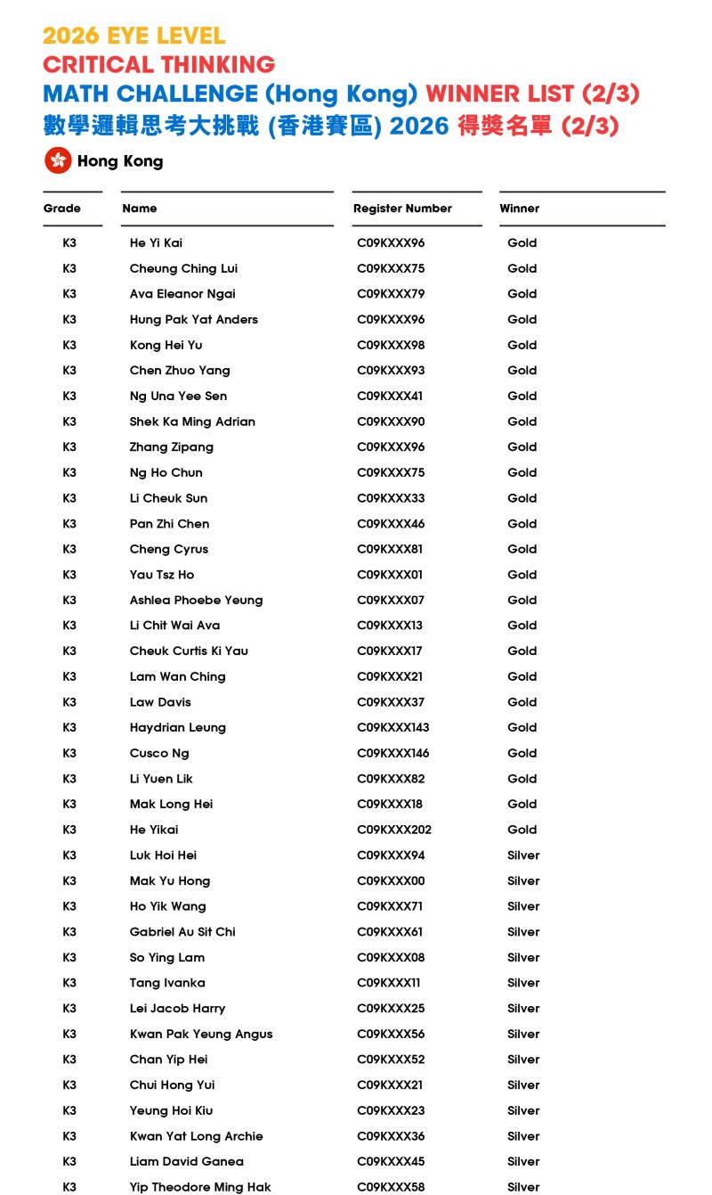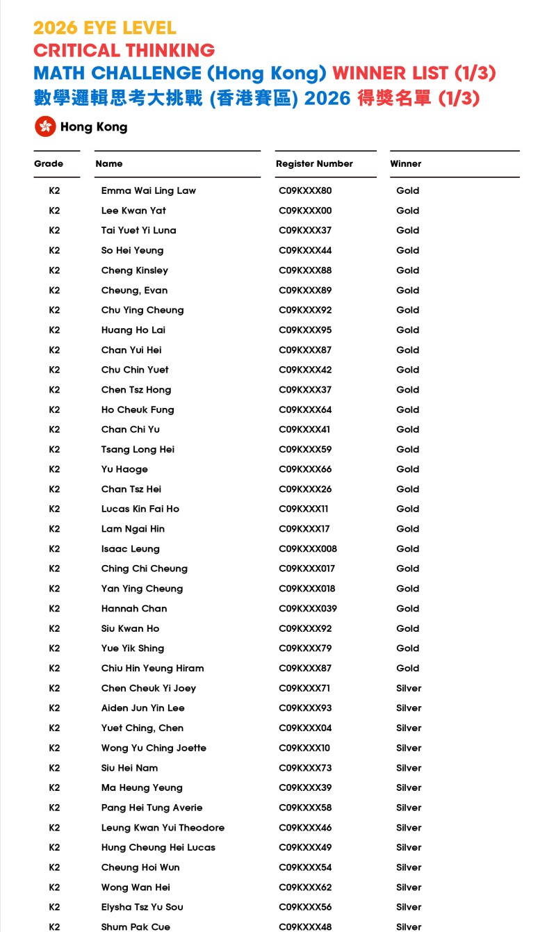Eye Level 全港數學邏輯思考大挑戰 2026 成績公佈 Eye Level Critical Thinking Math Challenge 2026 Result Announcement (HK)